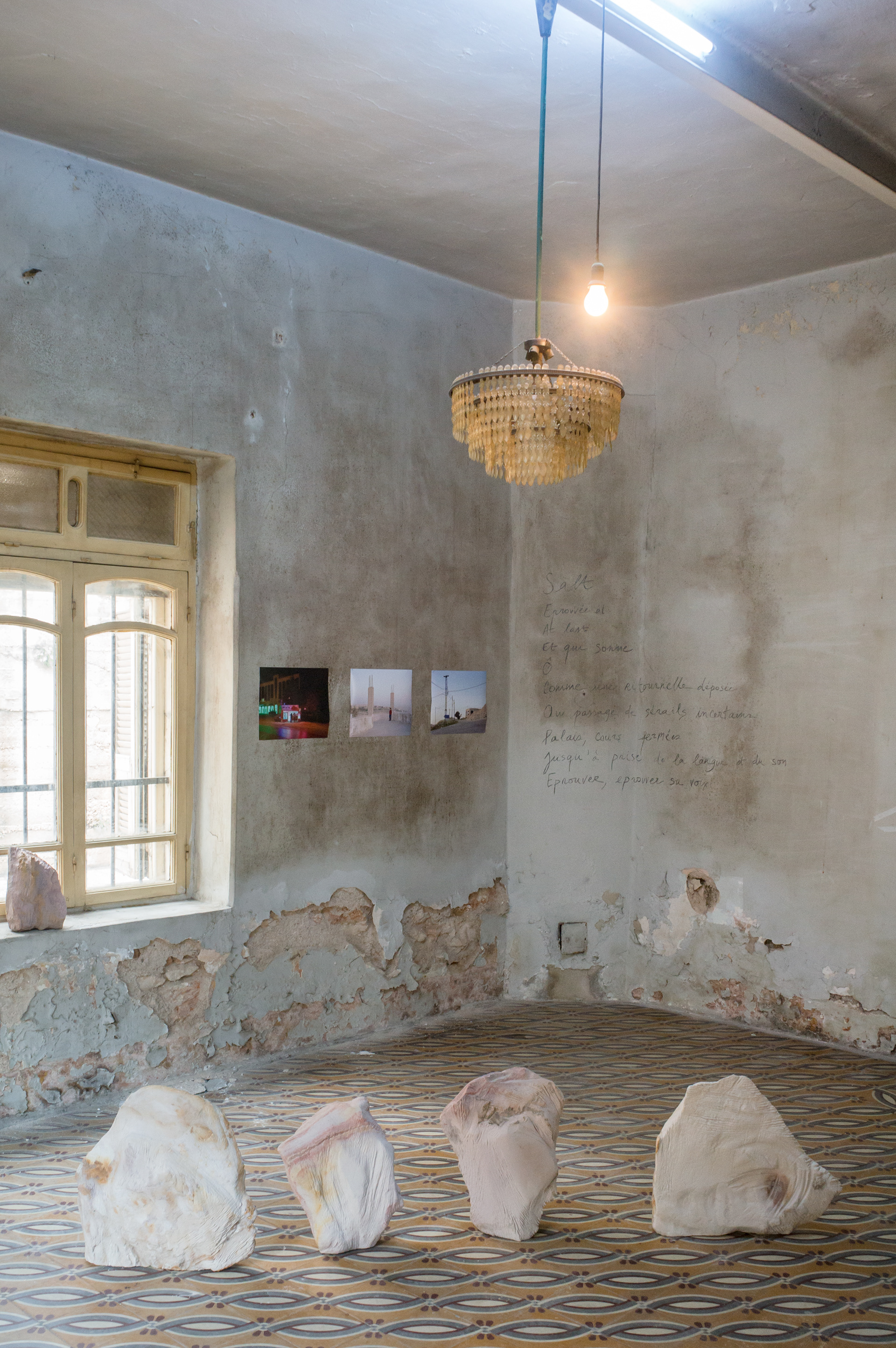 Le 2 mars 2014, nous découvrons Salt en compagnie de Nadia Bseiso, Mohamed Naif et Razan Fakhouri, photographes jordaniens et, six jours durant, nous arpentons la ville et sa périphérie. On se perd, on se croise et le soir on se retrouve en essayant d’imaginer une forme pour les expositions de la Zara Center Gallery et de la galerie Dar Alanda aux pieds de laquelle nous avons découvert une maison traditionnelle ammanie que nous décidons d’investir. Le Quatuor Ebene boucle sa mélodie, Alexander invente la bande son. Nous montons les projections, assemblons les textes, les images et les sons. Le jour du vernissage arrive, Salt est là, quelque part, déconstruite, assemblée.